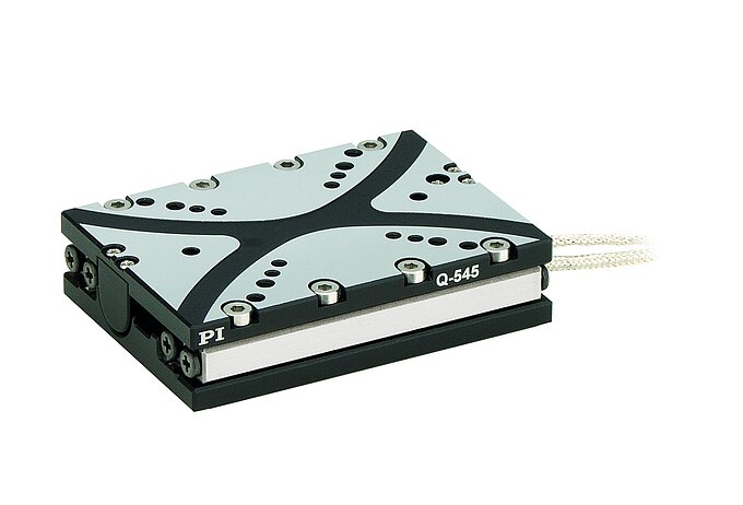 A radiation cage with mirror and lenses is moved vertically to set the critical angle required in the GATTAscope, so the beam does not go through the center of the lens but is deflected to the edge at a certain angle. Total reflection is achieved when the critical angle is reached exactly. Two Q-545 Q-Motion® precision linear drives take care of this job. Thanks to their piezoelectric inertia principle, they provide high nanometer-accurate position resolution, are compact and on top of that, inexpensive. Control is done by the E-870 PIShift driver electronics.