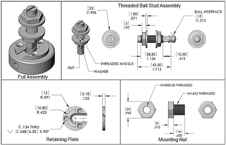 Part # | Diameter / mm | Ball interface diameter / mm | Load capacity / N | Stiffness / N/µm | Air consumption / l/h (SCFH) | Mass / g |