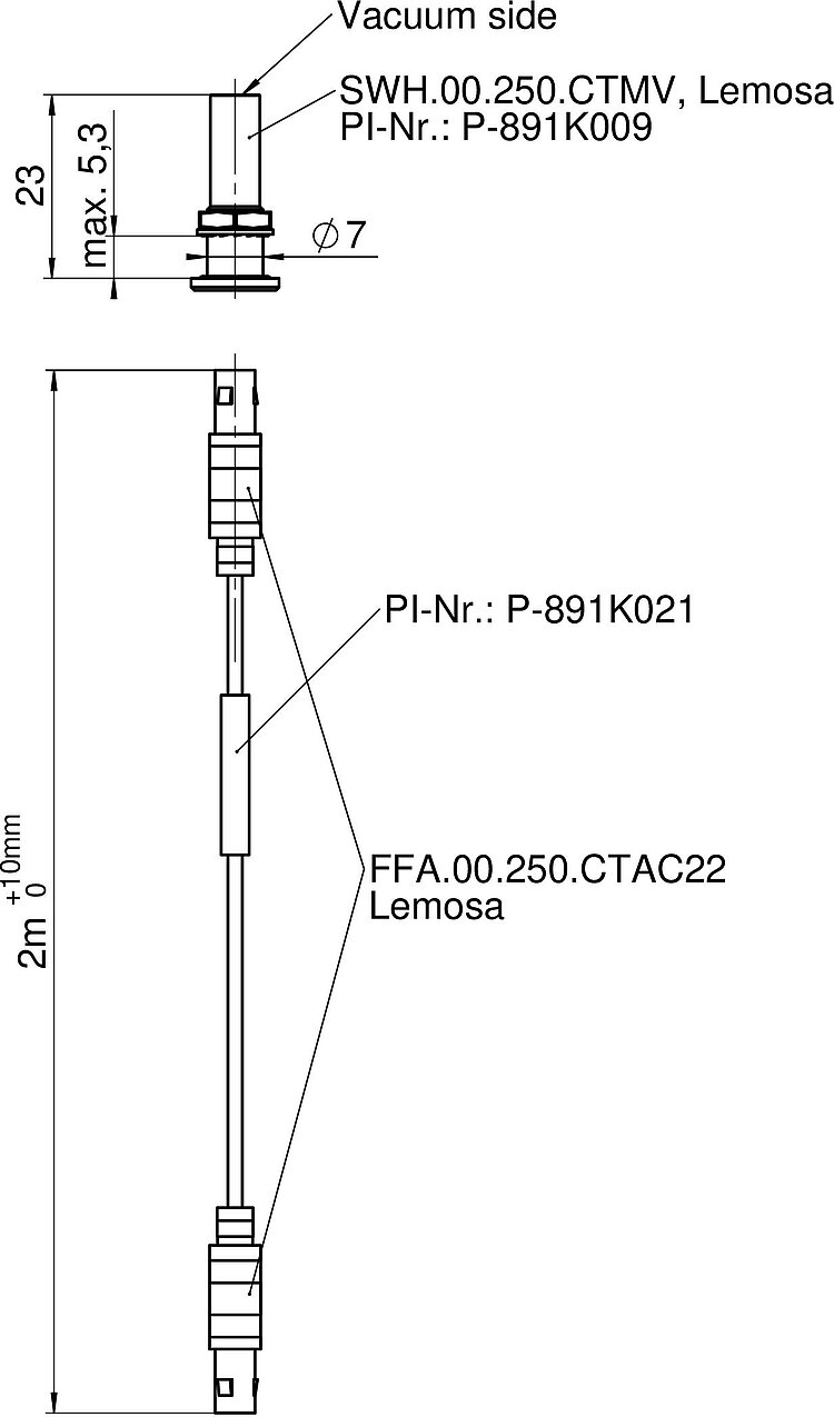 Vacuum feedthrough for piezo voltage, LEMO connector, 100 °C bakeout temperature, suitable for high vacuum (up to 10-6 hPa), including air-side cable, 2 m